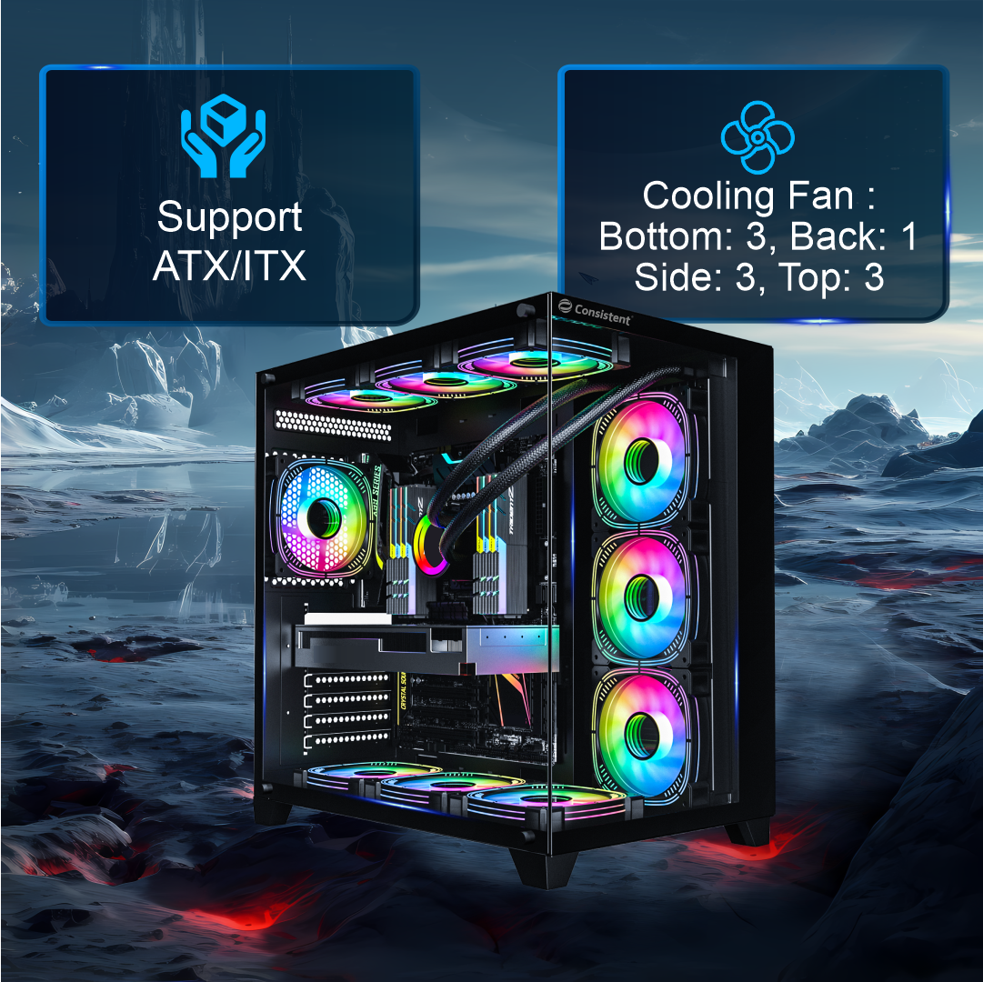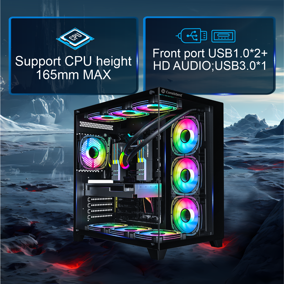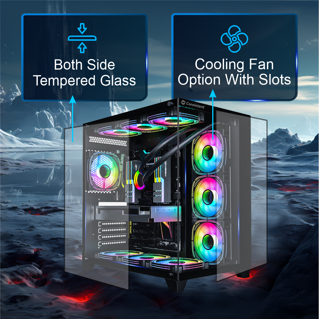 Its standout feature is the dual tempered glass panels on both sides, offering an unobstructed view of your internal components and RGB lighting, making it perfect for enthusiasts who love showcasing their builds. The cabinet also includes a front I/O panel with two USB 2.0 ports, one USB 3.0 port, and HD Audio, ensuring easy access for peripherals and headsets.