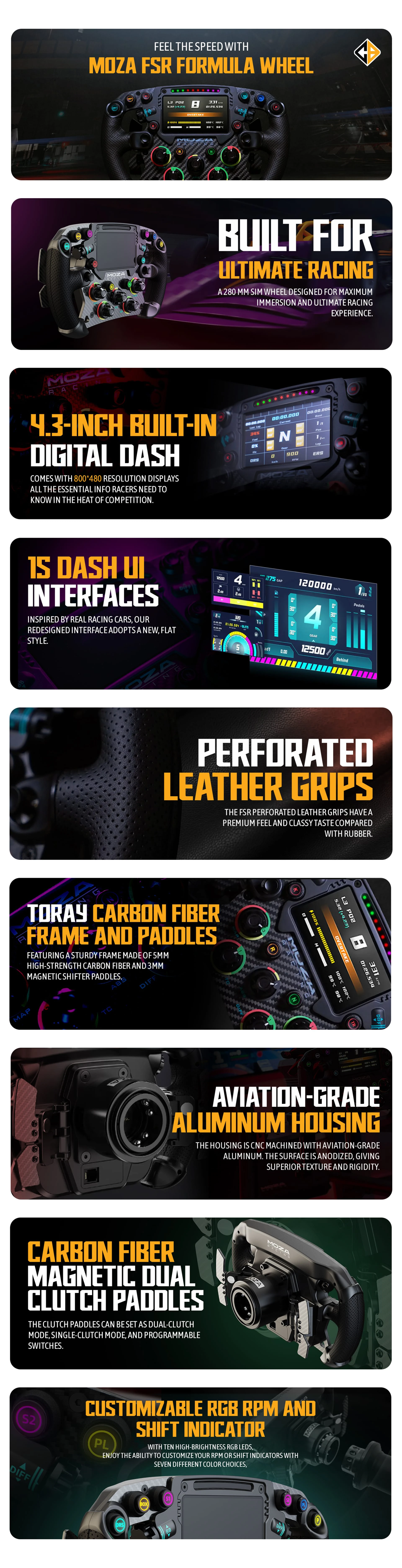 MOZA FSR Formula Wheel. This 280mm wheel boasts a vibrant 4.3-inch touchscreen, customizable UI, and precision controls, including a 6-paddle design and RGB signal lights. Built with a carbon fiber frame, aluminum quick release, and a high-performance processor, it offers seamless integration with MOZA and third-party racing bases. Perfect for competitive sim racers seeking unmatched control and immersion.